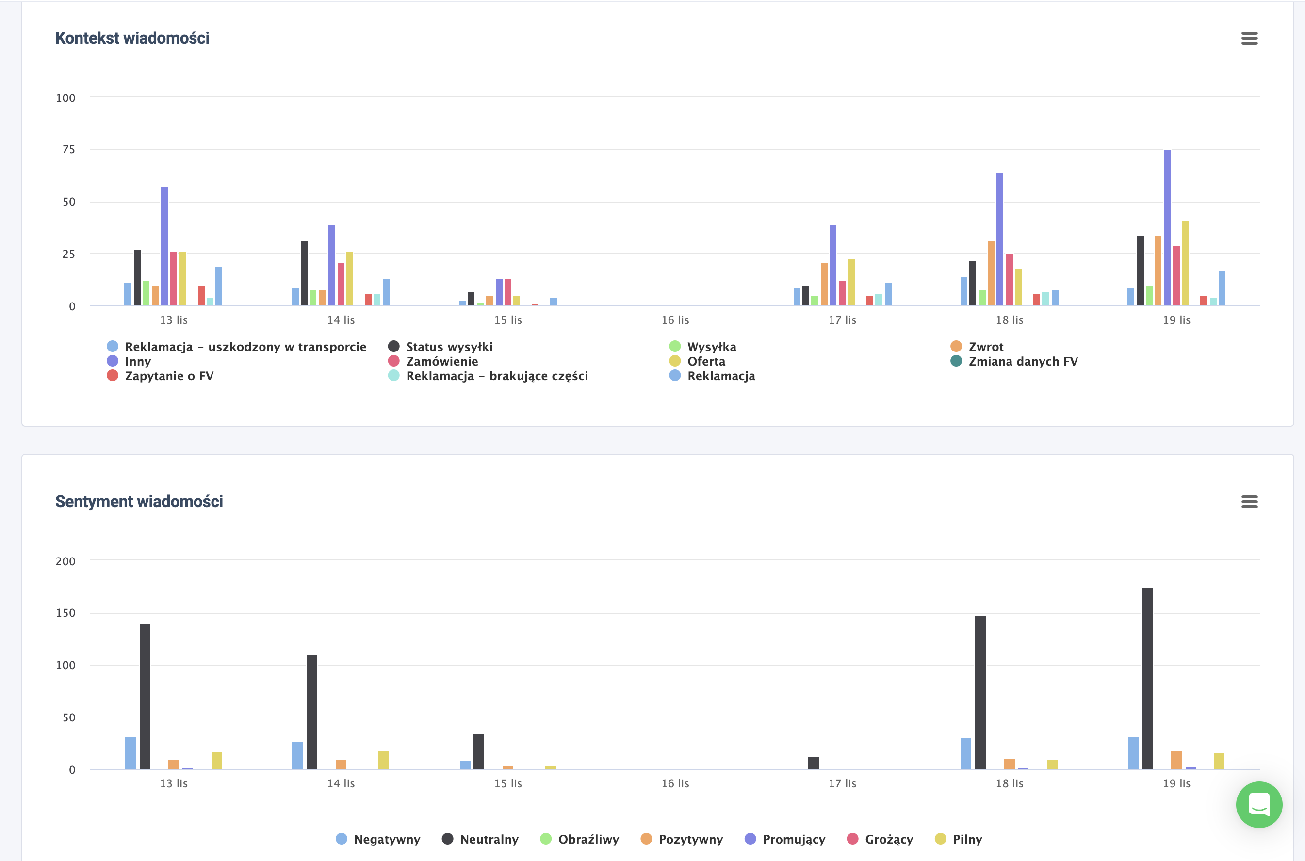 <figure><img src="https://2081275209-files.gitbook.io/~/files/v0/b/gitbook-x-prod.appspot.com/o/spaces%2FNxBd7AiJvoHKedJlJN54%2Fuploads%2FdeMz3bIQ8iZydNIs4CpN%2Fimage%20(49).png?alt=media&#x26;token=72a69a23-f2a1-4d65-a10a-43bed6862aa7" alt=""><figcaption><p><em>Raporty ticketólw z podziałek na konteksty i sentymenty</em></p></figcaption></figure>