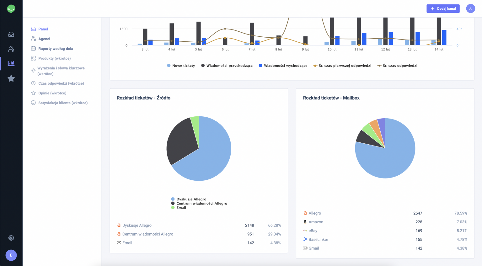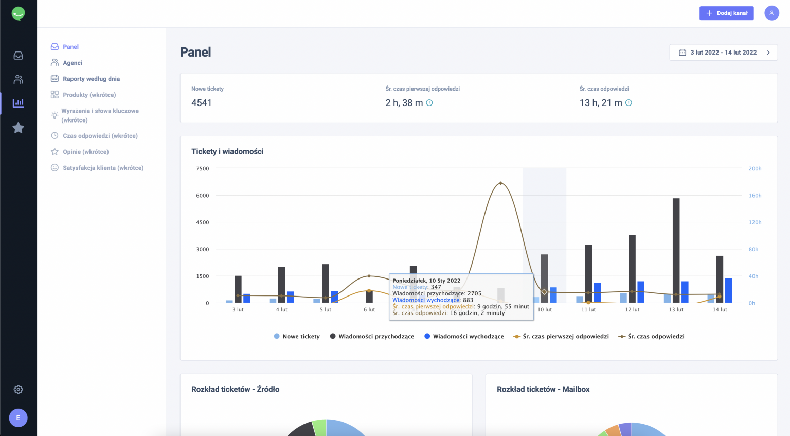 * wykresy pokazujące rozkład ticketów w podziale na źródło (integracje), a także w podziale na mailboxy, czyli konkretne konta w ramach danych integracji.